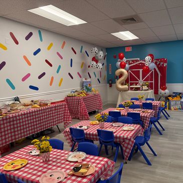 Play and activities are offered in our main play areas. Food and cake are served in our private party room.